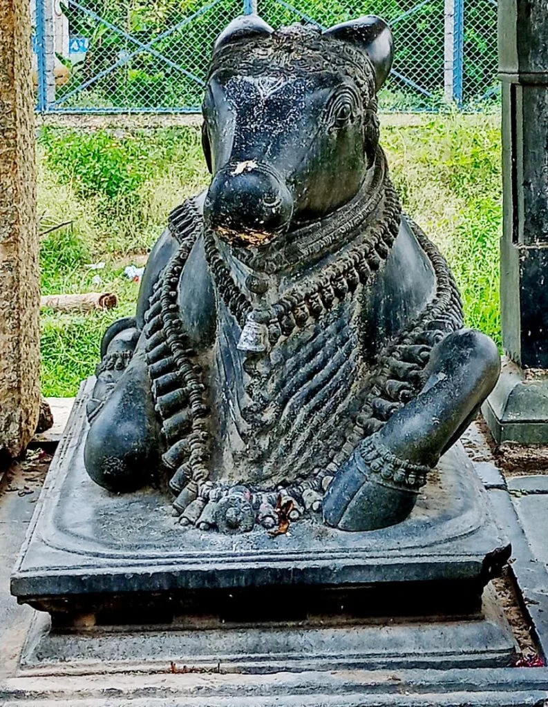 - A massive monolithic statue of Nandi (Shiva’s bull) is positioned in the temple complex.